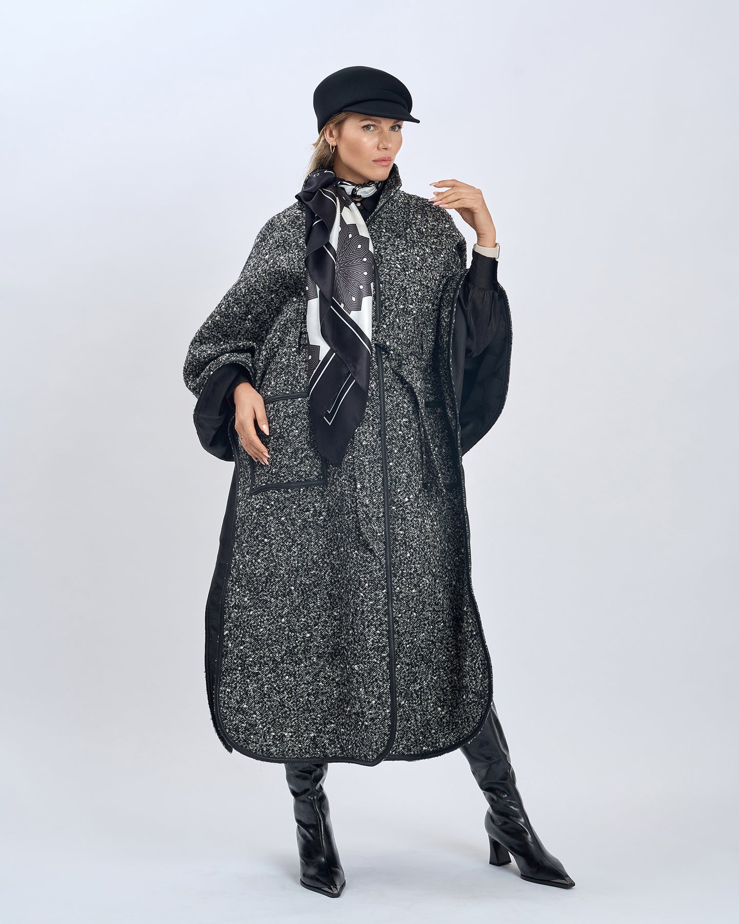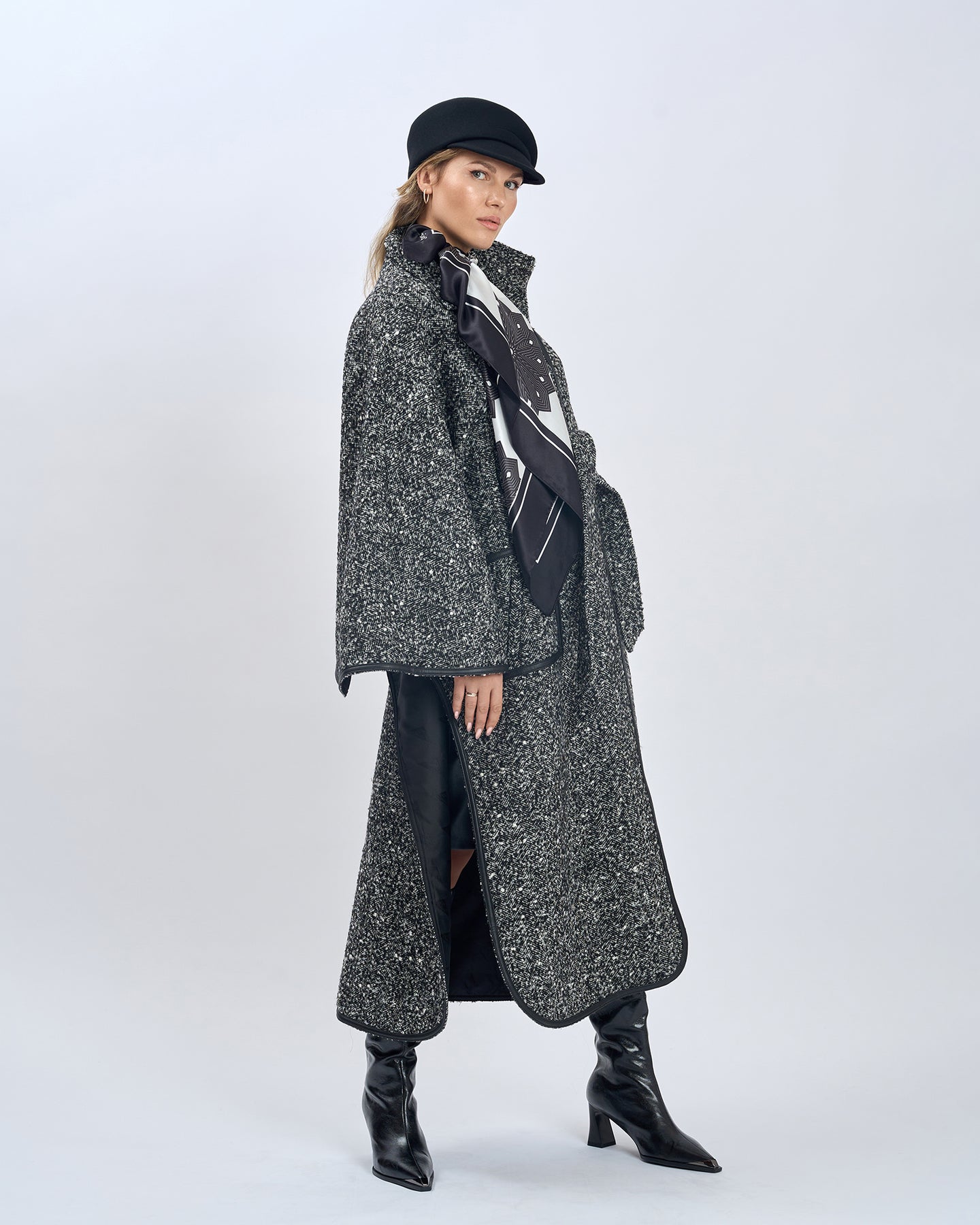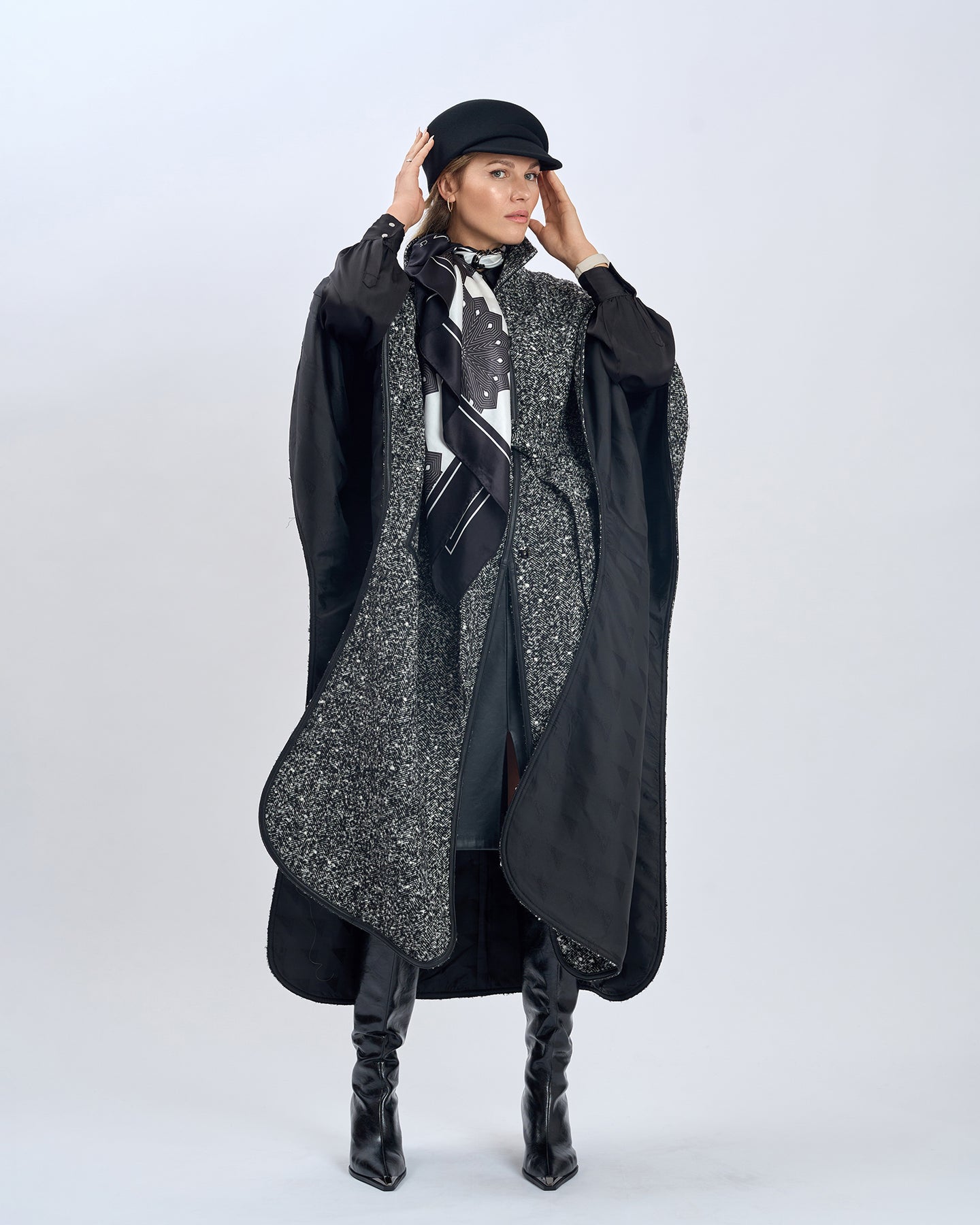 The UMBRELLAS RAIN Mandala Silk Scarf in Black and White from Alesia C.’s Wearable Art Collection is a timeless accessory that combines elegance with artistic expression. Featuring digitally printed mandala artwork based on designer Alesia Chaika’s original designs, this luxury scarf brings a sense of purity and sophistication to any outfit.
